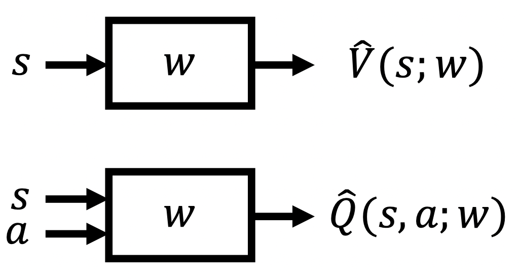 We will write $\hat{v}(s; \mathbf{w}) \approx v_{\pi}(s)$ for the approximate value of state $s$ given weight vector $\mathbf{w}$ .