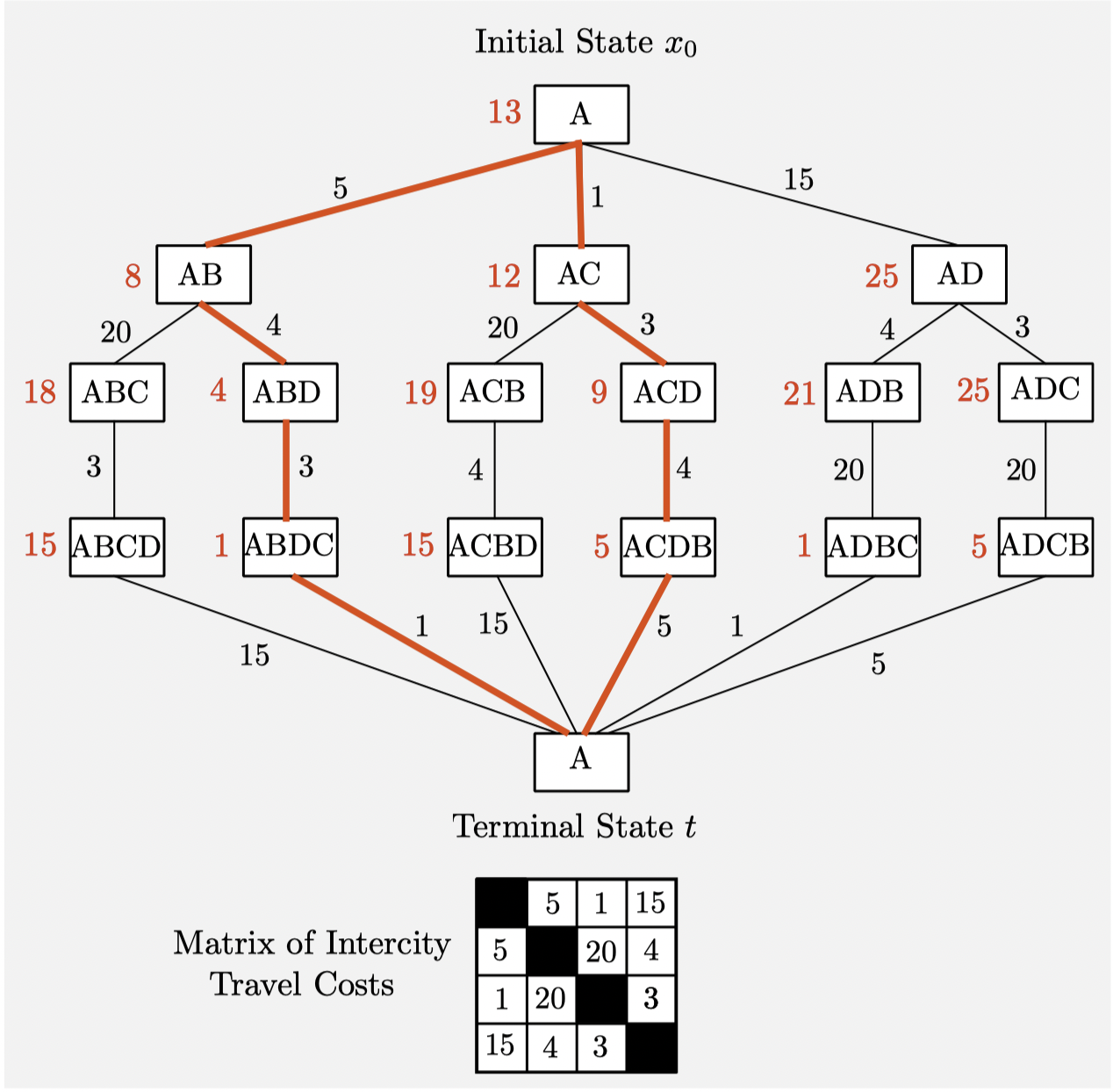Start with $$ J_N^\ast (x_N) = g_N(x_N), \quad \text{ for all } x_N $$ and for $k=0, \dots, N-1$, let $$ J_{k}^{\ast}\left(x_{k}\right)=\min _{u_{k} \in U_{k}\left(x_{k}\right)}\left[g_{k}\left(x_{k}, u_{k}\right)+J_{k+1}^{\ast}\left(f_{k}\left(x_{k}, u_{k}\right)\right)\right], \quad \text { for all } x_{k} $$ The algorithm constructs functions $J_N^\ast(x_N), J_{N-1}^\ast(x_{N-1}), \dots, J_0^\ast(x_0)$ sequentially, starting from $J_N^\ast$, and proceeding backwards to $J_{N-1}^\ast, J_{N-2}^\ast, \dots$ .